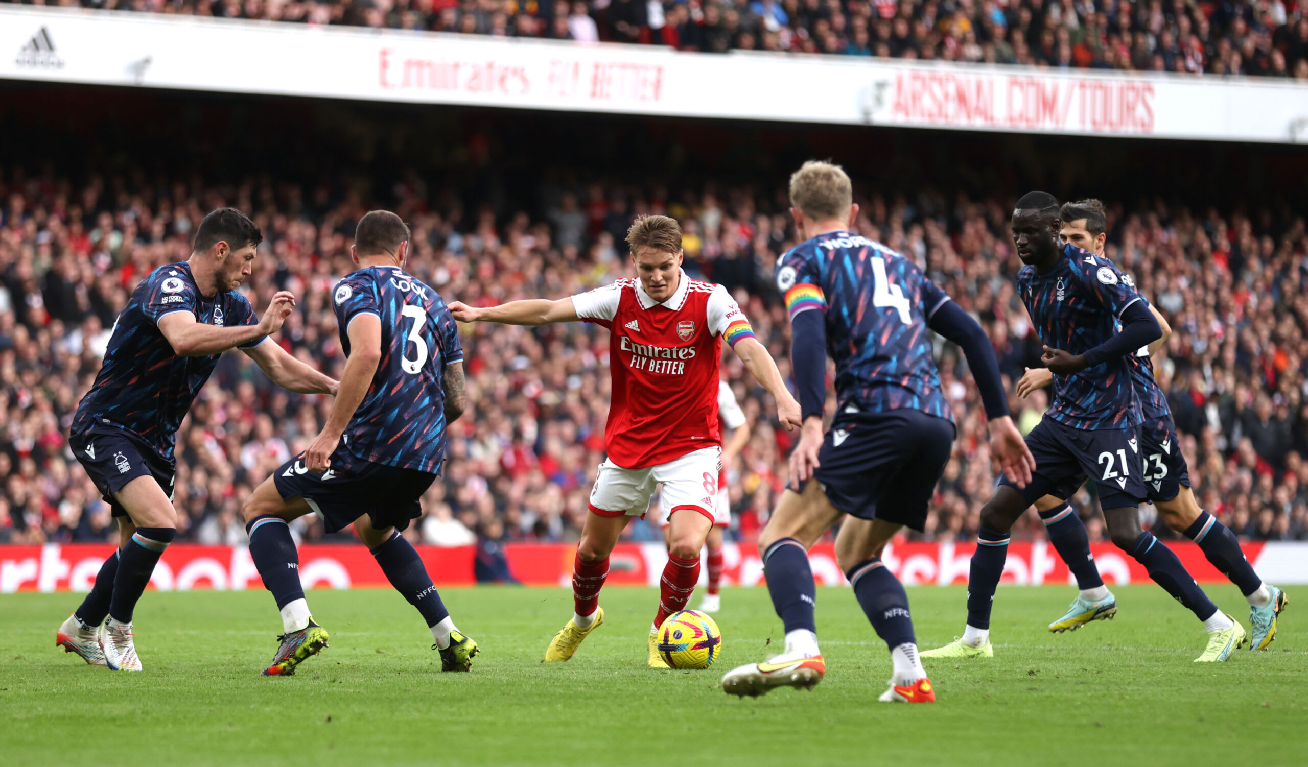 LONDON, ENGLAND - OCTOBER 30: Martin Odegaard is surrounded by Nottingham Forest players before scoring his sides fifth goal during the Premier League match between Arsenal FC and Nottingham Forest at Emirates Stadium on October 30, 2022 in London, England. (Photo by Alex Pantling/Getty Images)