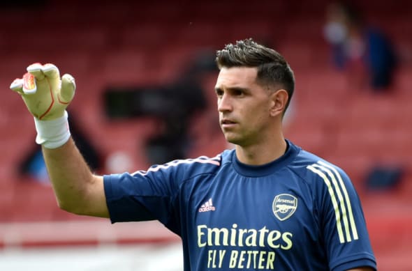 LONDON, ENGLAND – JULY 26: Emiliano Martinez of Arsenal warms up prior to the Premier League match between Arsenal FC and Watford FC at Emirates Stadium on July 26, 2020 in London, England. Football Stadiums around Europe remain empty due to the Coronavirus Pandemic as Government social distancing laws prohibit fans inside venues resulting in all fixtures being played behind closed doors. (Photo by Rui Vieira/Pool via Getty Images)