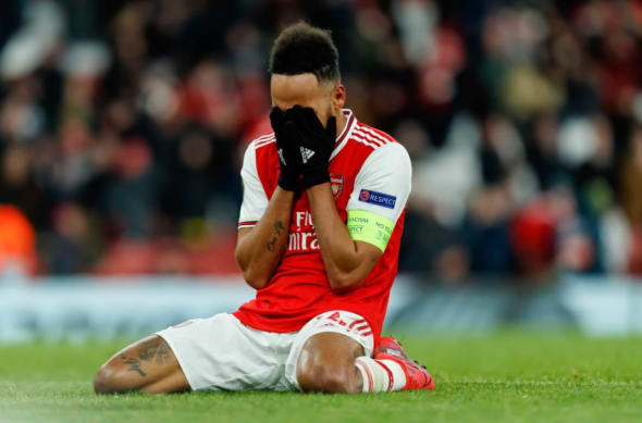 LONDON, ENGLAND – FEBRUARY 27: (BILD ZEITUNG OUT) Pierre-Emerick Aubameyang of Arsenal FC looks dejected after the UEFA Europa League round of 32 second leg match between Arsenal FC and Olympiacos FC at Emirates Stadium on February 27, 2020 in London, United Kingdom. (Photo by Roland Krivec/DeFodi Images via Getty Images)