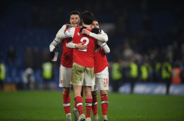 LONDON, ENGLAND – JANUARY 21: Hector Bellerin embraces Gabriel Martinelli and Lucas Torreira of Arsenal during the Premier League match between Chelsea FC and Arsenal FC at Stamford Bridge on January 21, 2020 in London, United Kingdom. (Photo by Mike Hewitt/Getty Images)