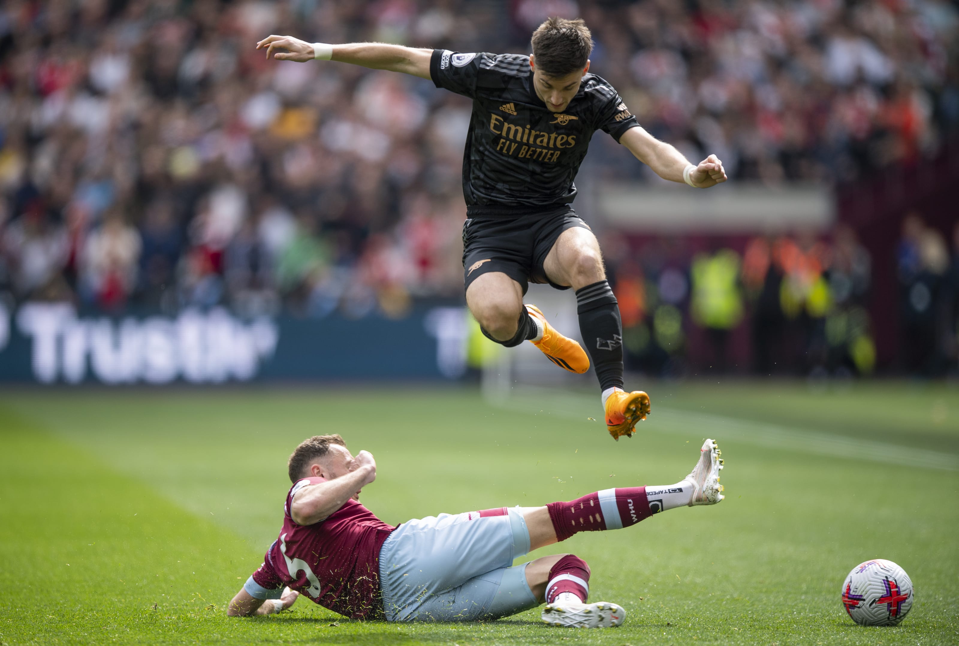 LONDON, ENGLAND - MARCH 19: Kieran Tierney of Arsenal is challenged by Michael Olise of Crystal Palace during the Premier League match between Arsenal FC and Crystal Palace at Emirates Stadium on March 19, 2023 in London, England. (Photo by Shaun Botterill/Getty Images)