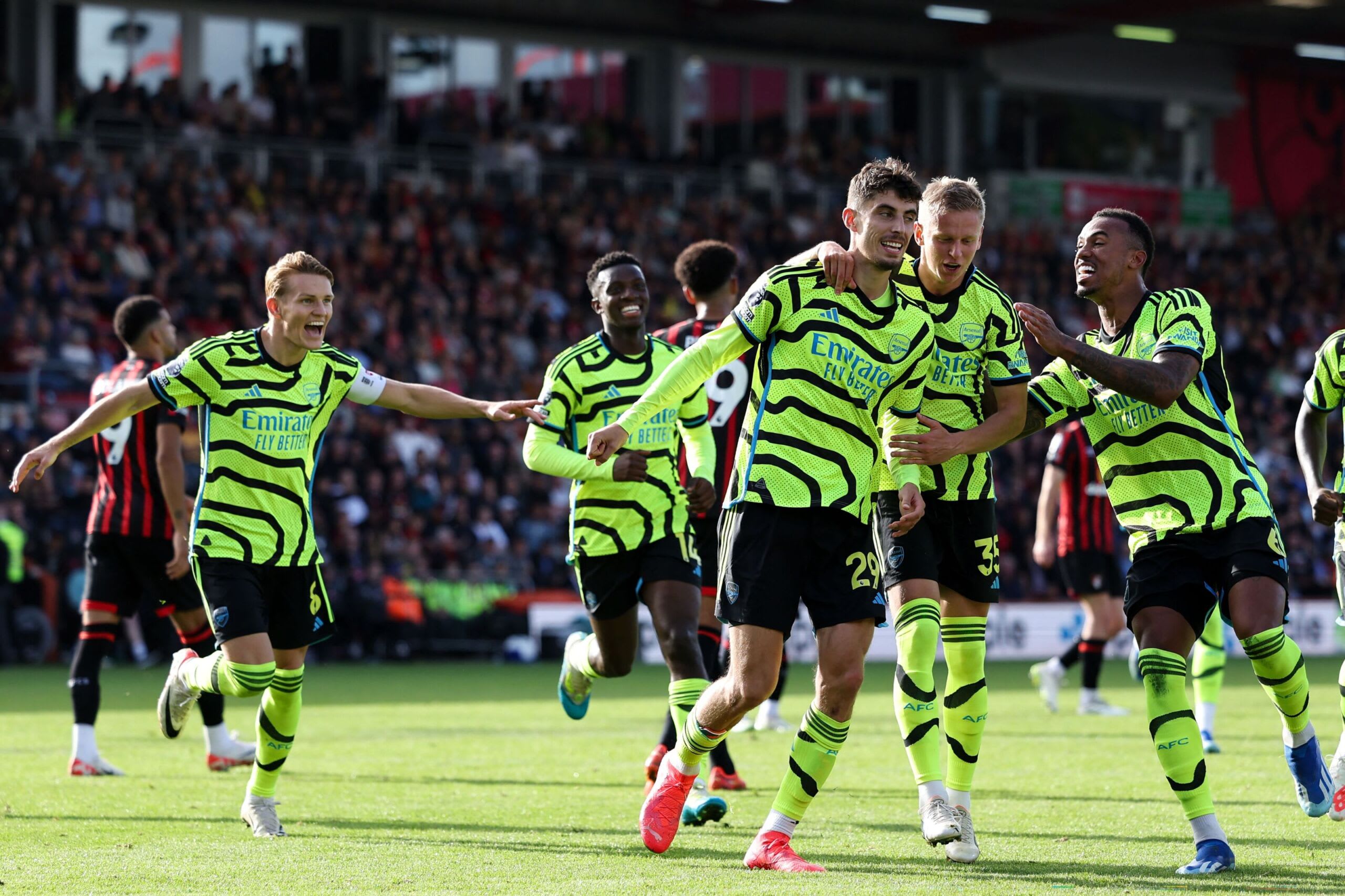 Arsenal celebrate Kai Havertz’s first Arsenal goal at Bournemouth. (Photo by ADRIAN DENNIS/AFP via Getty Images)