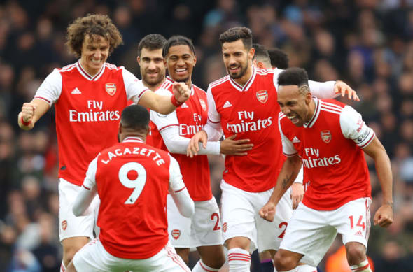 LONDON, ENGLAND – MARCH 07: Alexandre Lacazette of Arsenal celebrates with teammates after scoring his team’s first goal which was given by VAR during the Premier League match between Arsenal FC and West Ham United at Emirates Stadium on March 07, 2020 in London, United Kingdom. (Photo by Julian Finney/Getty Images)
