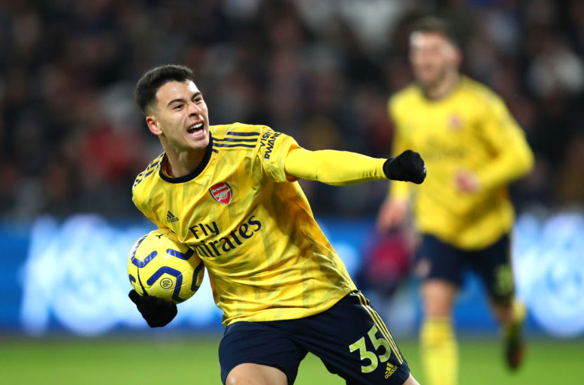 LONDON, ENGLAND – DECEMBER 09: Gabriel Martinelli of Arsenal celebrates after scoring his sides first goal during the Premier League match between West Ham United and Arsenal FC at London Stadium on December 09, 2019 in London, United Kingdom. (Photo by Julian Finney/Getty Images)