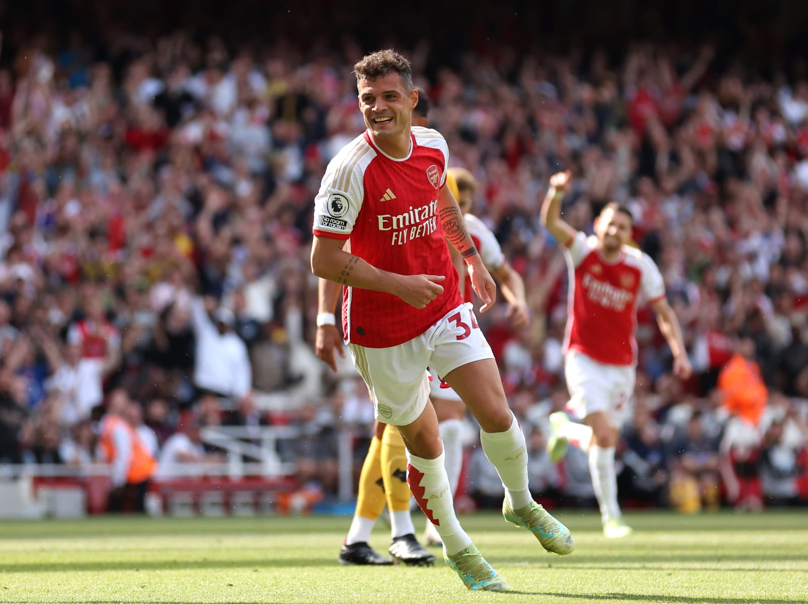 Arsenal's Swiss midfielder Granit Xhaka (back C) celebrates with teammates after scoring his team's first goal during the English Premier League football match between Arsenal and Wolverhampton Wanderers at the Emirates Stadium in London on May 28, 2023. (Photo by Glyn KIRK / AFP) / RESTRICTED TO EDITORIAL USE. No use with unauthorized audio, video, data, fixture lists, club/league logos or 'live' services. Online in-match use limited to 120 images. An additional 40 images may be used in extra time. No video emulation. Social media in-match use limited to 120 images. An additional 40 images may be used in extra time. No use in betting publications, games or single club/league/player publications. / (Photo by GLYN KIRK/AFP via Getty Images)