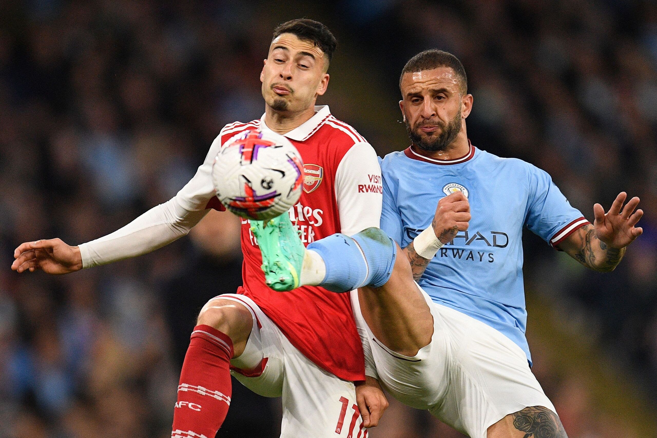 Arsenal players react after conceding a third goal during the English Premier League football match between Manchester City and Arsenal at the Etihad Stadium in Manchester, north west England, on April 26, 2023. (Photo by Oli SCARFF / AFP) / RESTRICTED TO EDITORIAL USE. No use with unauthorized audio, video, data, fixture lists, club/league logos or 'live' services. Online in-match use limited to 120 images. An additional 40 images may be used in extra time. No video emulation. Social media in-match use limited to 120 images. An additional 40 images may be used in extra time. No use in betting publications, games or single club/league/player publications. / (Photo by OLI SCARFF/AFP via Getty Images)