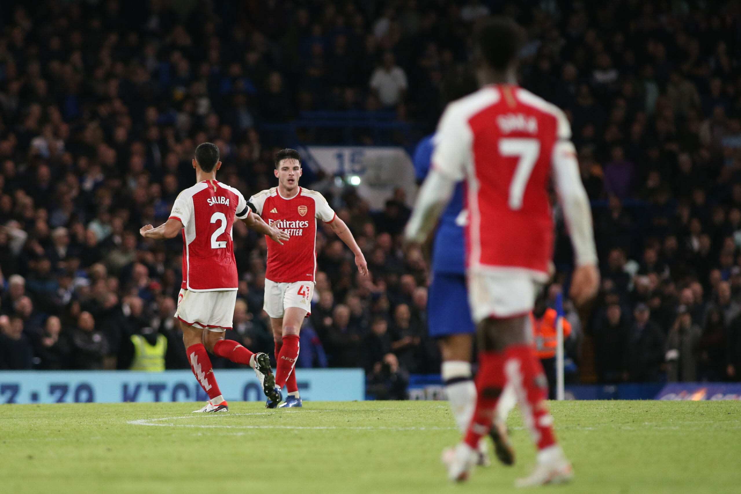 LONDON, ENGLAND - OCTOBER 21: Declan Rice of Arsenal celebrates with teammate William Saliba after scoring a goal 2-1 during the Premier League match between Chelsea FC and Arsenal FC at Stamford Bridge on October 21, 2023 in London, England. (Photo by MB Media/Getty Images)