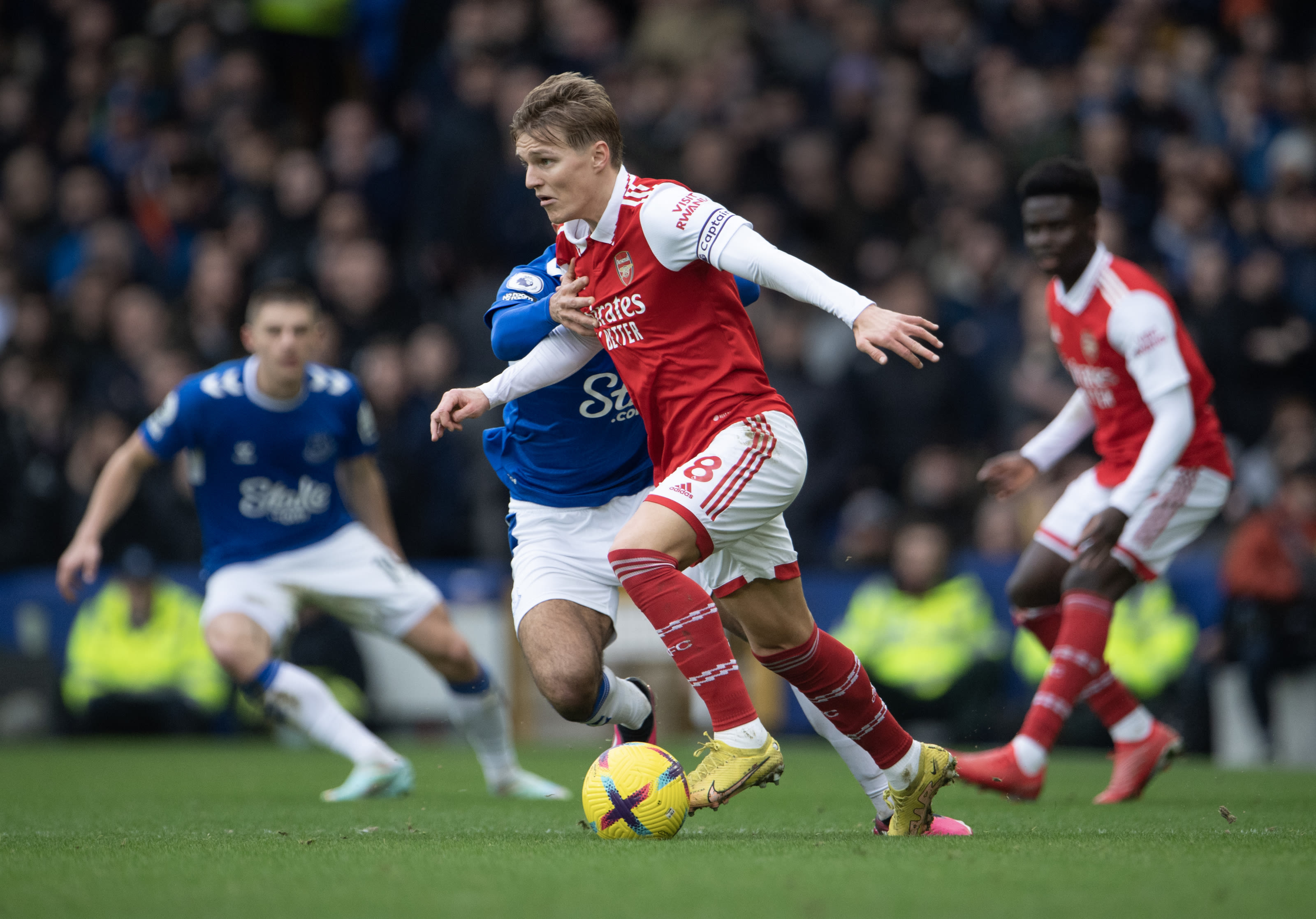 LIVERPOOL, ENGLAND – FEBRUARY 04: Martin Odegaard of Arsenal and Dwight McNeil of Everton in action during the Premier League match between Everton FC and Arsenal FC at Goodison Park on February 4, 2023 in Liverpool, United Kingdom. (Photo by Visionhaus/Getty Images)