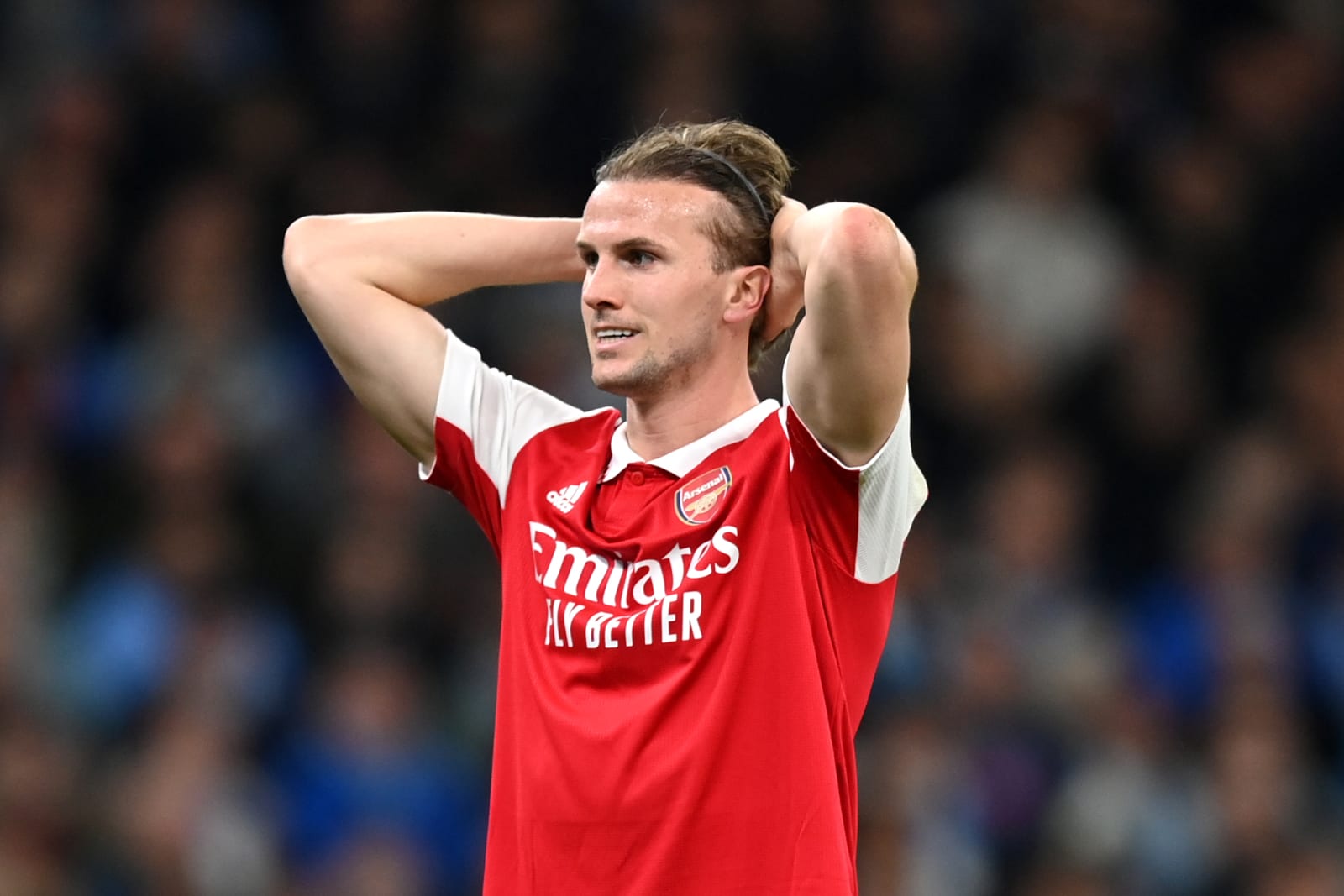 MANCHESTER, ENGLAND – APRIL 26: Rob Holding of Arsenal reacts after Manchester City scored their side’s third goal during the Premier League match between Manchester City and Arsenal FC at Etihad Stadium on April 26, 2023, in Manchester, England. (Photo by Michael Regan/Getty Images)