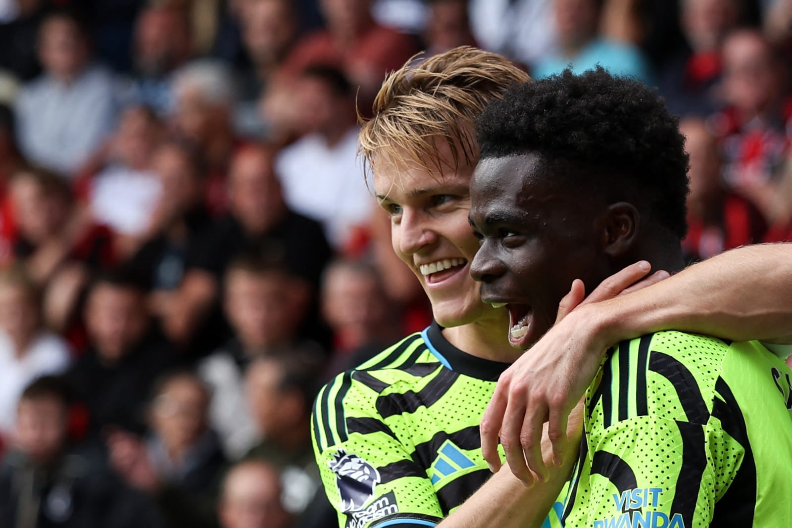 Arsenal's Spanish manager Mikel Arteta (L) and Arsenal's Norwegian midfielder #08 Martin Odegaard react after the English Premier League football match between Bournemouth and Arsenal at the Vitality Stadium in Bournemouth, southern England on September 30, 2023. (Photo by Adrian DENNIS / AFP) / RESTRICTED TO EDITORIAL USE. No use with unauthorized audio, video, data, fixture lists, club/league logos or 'live' services. Online in-match use limited to 120 images. An additional 40 images may be used in extra time. No video emulation. Social media in-match use limited to 120 images. An additional 40 images may be used in extra time. No use in betting publications, games or single club/league/player publications. / (Photo by ADRIAN DENNIS/AFP via Getty Images)