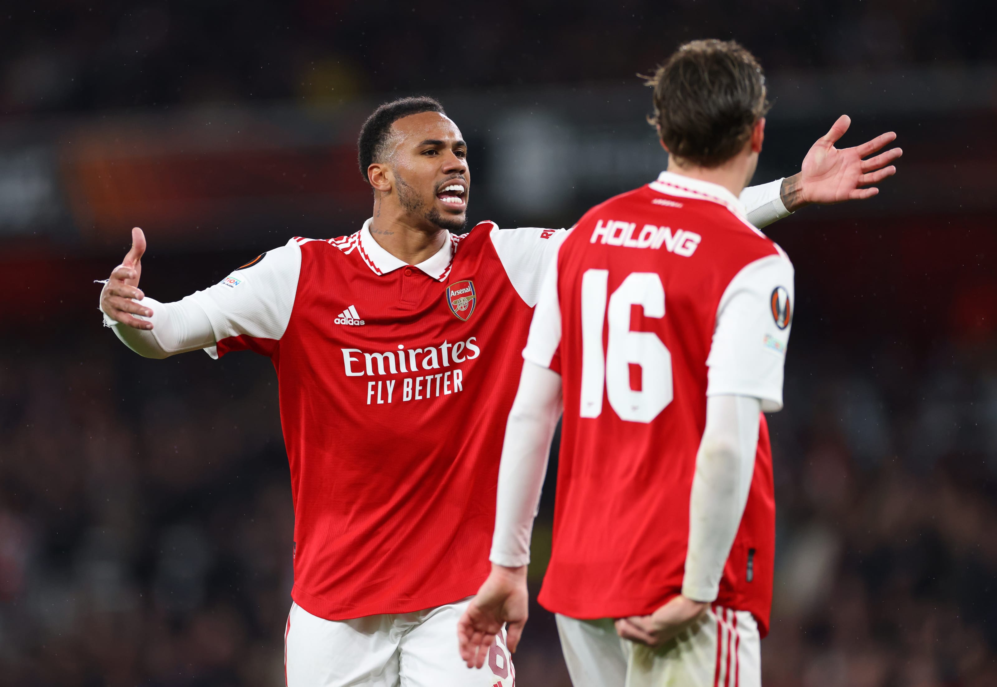 LONDON, ENGLAND - MARCH 16: Gabriel Magalhaes and Rob Holding of Arsenal during the UEFA Europa League round of 16 leg two match between Arsenal FC and Sporting CP at Emirates Stadium on March 16, 2023 in London, United Kingdom. (Photo by Marc Atkins/Getty Images)